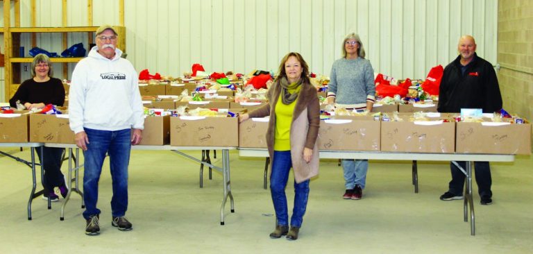 The Christmas Hamper program, put on by the Claresholm Local Press with assistance from Claresholm and District Family and Community Support Services, distributed 120 hampers locally containing a complete Christmas dinner plus items to help over the next month to families in need, leading up to Christmas. Volunteers were busy getting the hampers ready for distribution on Wednesday, Dec. 22, at this year’s location in the former Claresholm Glass building on the east side of Claresholm. From left are Maxine Middleton; Keith Thompson; Roxanne Thompson, organizer and coordinator of the program; Marie Vander Linden; and Dale Seeman.