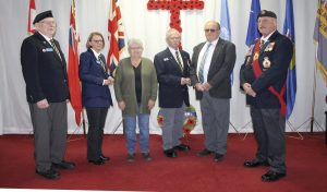The 2025 poppy campaign kicked off on Friday, Oct. 31 at the Claresholm branch of the Royal Canadian Legion with the Mayors of Claresholm and Stavely receiving the first poppies. From left are Duane Southgate, second vice-president of the Legion; Mary Walsh, first vice-president; Ramona Whittingham, mayor of Stavely; Brad Schlossberger, mayor of Claresholm; Leonard Weiss, president; and Brian Thibeau, sergeant-at-arms. Photo by Rob Vogt