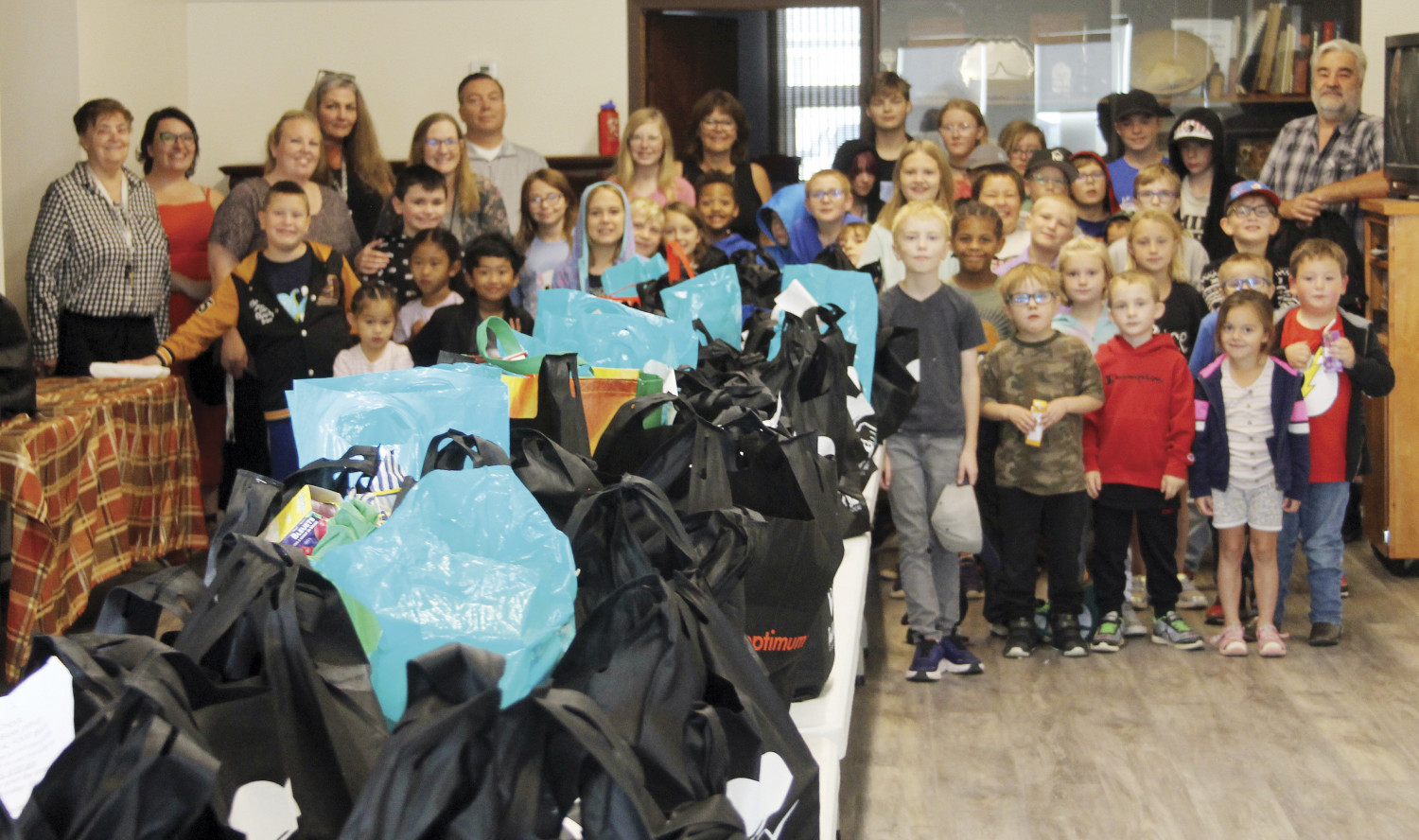 Granum School held a food drive for the Granum Food Bank, distributing bags to every house in the community on Sept. 15, then gathering and delivering them to the food bank on Sept. 18. Here, students, staff and volunteers stand behind all the donations collected.