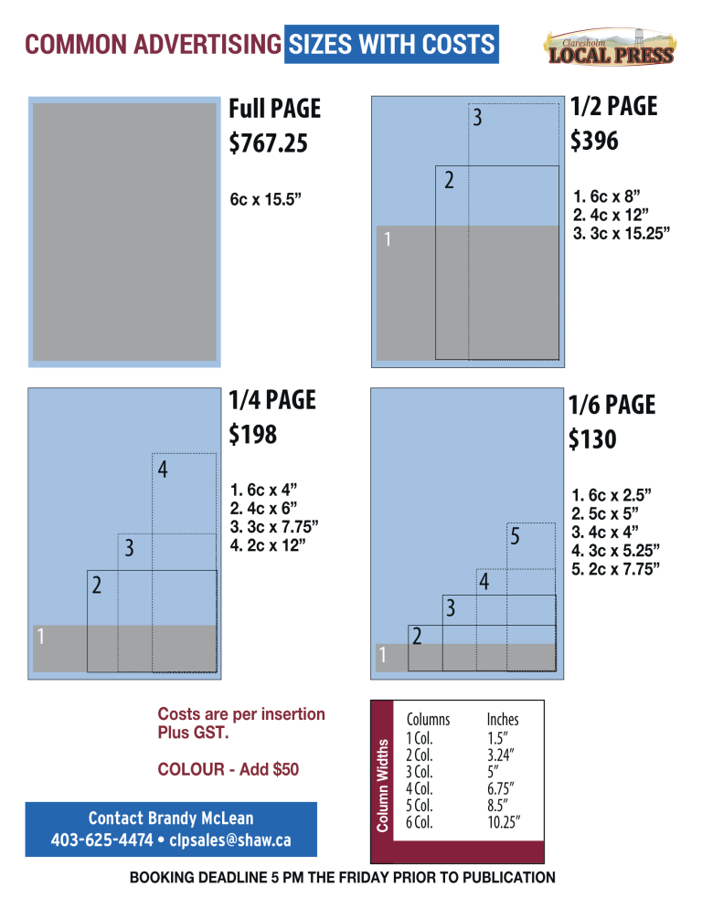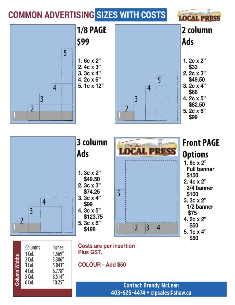 Please scroll down to see the different options and rates we have available at the Claresholm Local Press, or feel free to contact us in order to discuss what the best approach for your budget and business type might be!
